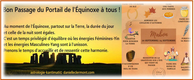 « L’Équinoxe du 22 septembre marque un tournant dans l’année astrologique. L’énergie commence à se déplacer dans une nouvelle direction, guidant les choses vers le changement, l’évolution et la croissance. Si l’on considère l’année astrologique, l’Équinoxe de septembre est un point médian et le moment où nous commençons à approfondir les dossiers sur lesquels nous travaillons depuis le début de l’année. Bien que nous n’atteignions pas la fin de ce processus avant l’Équinoxe de septembre, nous pouvons réfléchir à cette étape de notre évolution et à la façon dont nous aimerions qu’elle se complète (avant l’arrivée de 2025) … Au moment de l’Équinoxe, le voile s’amincit. L’Équinoxe est depuis longtemps un moment sacré où le voile entre le monde physique et le monde spirituel s’amincit et où la grille énergétique de la planète entre dans une vibration plus rapide et dans une harmonie plus élevée. La Terre nourricière tout entière réagit à l’Équinoxe, et c’est quelque chose que nous pouvons même constater avec le changement de saison. Dans l’hémisphère Nord, la nature commence à se délester, à se libérer et à lâcher prise. Dans l’hémisphère Sud, la nature commence à fleurir et à s’épanouir. Quel que soit l’endroit où vous vivez, nous pouvons tous ressentir ce changement d’énergie dans nos vies. Nous pouvons constater que certaines choses ont besoin d’être libérées et que d’autres sont en pleine floraison. À l’aube de l’Équinoxe, il est possible de cristalliser ce qu’il faut développer et ce qu’il faut contracter. Nous pouvons commencer à voir ce qui est le plus important pour nous, ce à quoi nous voulons consacrer notre énergie et où nous voulons mettre nos intentions. Si nous nous sentons déséquilibrés ou si nous voulons fusionner avec les énergies de la Terre Mère, passons intentionnellement du temps à l’extérieur, en connexion avec la nature. Cette connexion avec la nature peut être incroyablement bienfaisante et elle peut faciliter nos guérisons. » – extraits du texte de Tanaaz / Source : Intuitive Astrology : September Equinox / Traduction et adaptation libre : Danielle Clermont