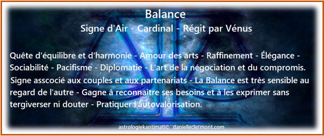 Au cours de la saison de la Balance (signe d’Air, cardinal, gouverné par la planète Vénus), nous allons sentir le besoin de nous entourer d’harmonie, de beauté et de paix. Vénus, maître de la Balance, nous invite aussi à nous détendre en accordant plus de temps à des activités artistiques. La Balance étant le signe par excellence qui gouverne tout ce que touche au “relationnel”, c’est une très bonne période pour revisiter comment nous nous relions aux autres, et pour renforcer nos liens en faisant preuve de tolérance et de compassion.